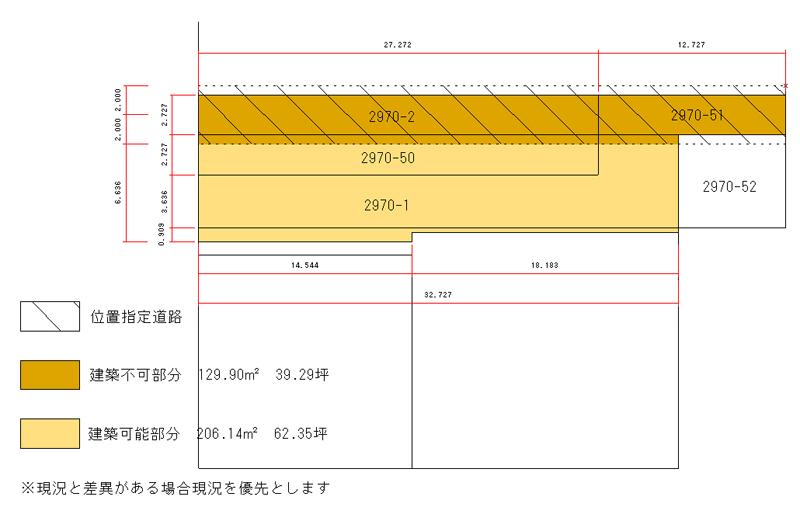西側隣地境界より約3.3m道路位置指定のため建築不可です