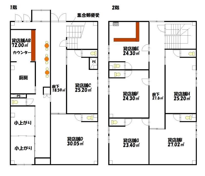 ◆銀座商店街にあるソシアルビル、8戸中すべて空室となっています。2階に未造作部分があります。