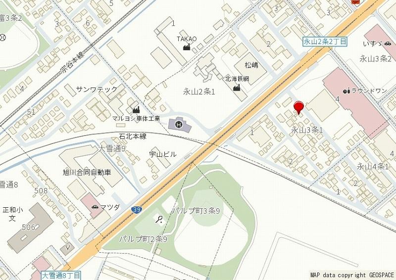 ■国道39号線からほど近くの場所に位置していて向かいにはラウンドワンスタジアムがあり、トライアル旭川店まで車で2分です。