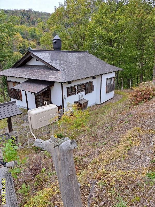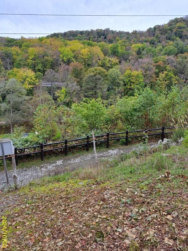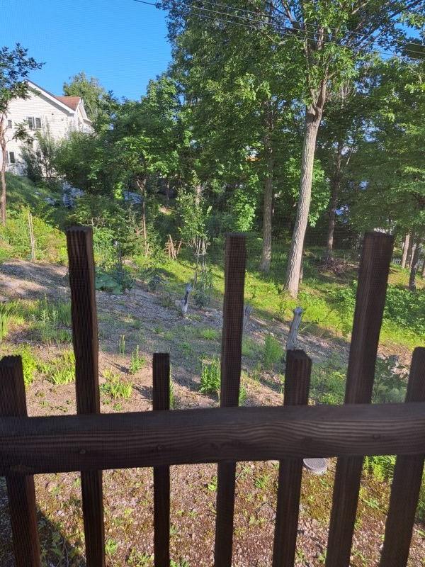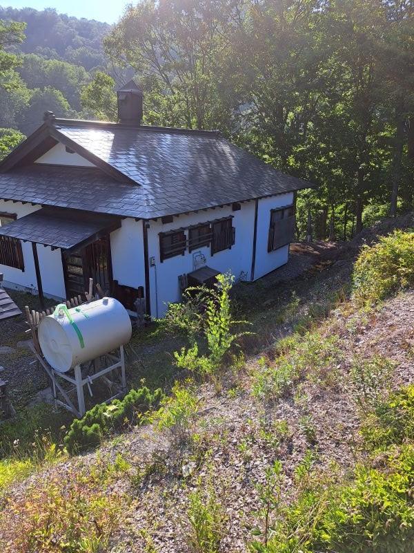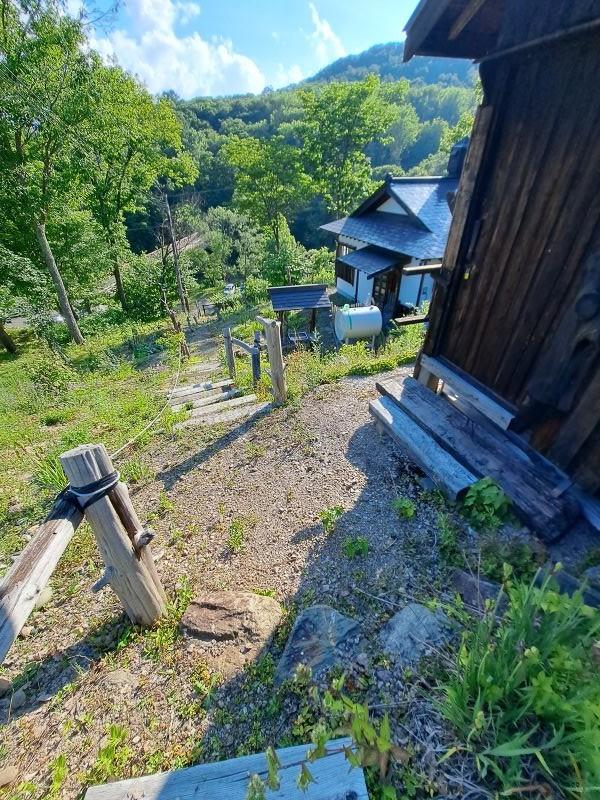 自然豊かな緑の中の平屋の一軒家。小高い庭から北邦野草園へ繋がる橋が見えます。傾斜地ですが、上の道路からも下の道路からも入る事が出来ます。