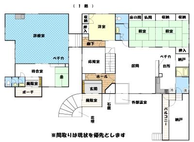 店舗付き、大型2世帯高級住宅 現在1階診療所(24.06坪) 住宅4LDKキッチン・洗面所・バス・トイレ付 納戸・バルコニー付き