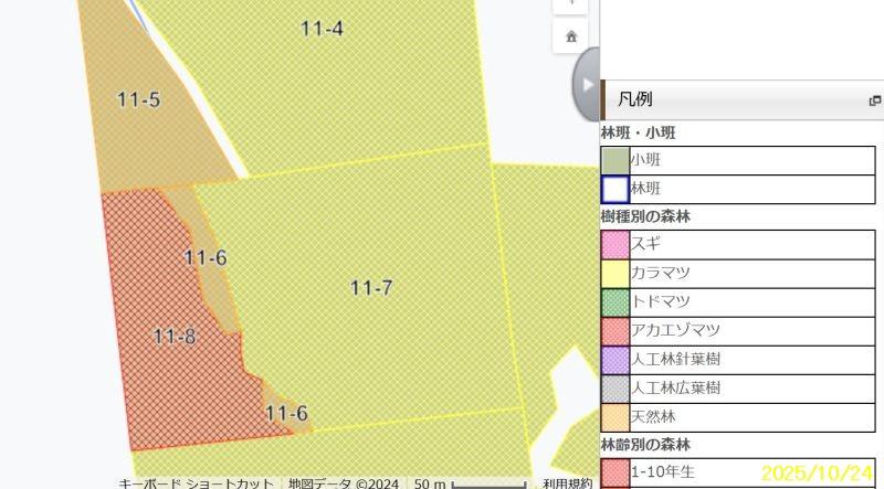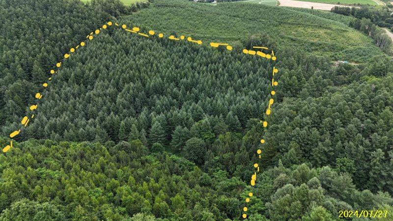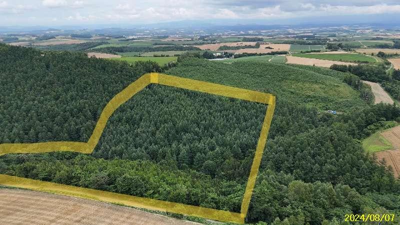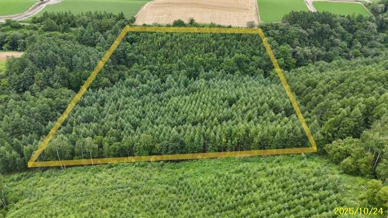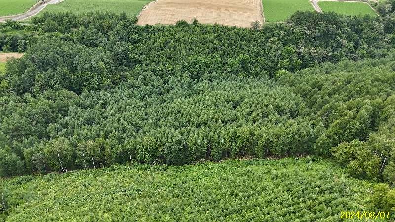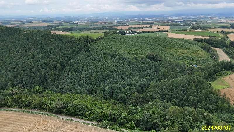 場所はここです🔜 https://maps.app.goo.gl/Dxkg9H9bwLUrnUJK9 丘陵の畑の間の山林です。 中央付近に4線川が流れて南に赤蝦夷松・北に落葉松林。近くにレストランSTEPLE