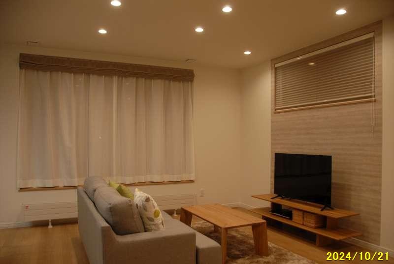 ■カーテン(1F) 2Fはレールのみ・家具(ソファ、センターテーブル、ラグマット、TVボード、ダイニングセット)付、外構付(建物周り・前面化粧砂利、防草シート)付