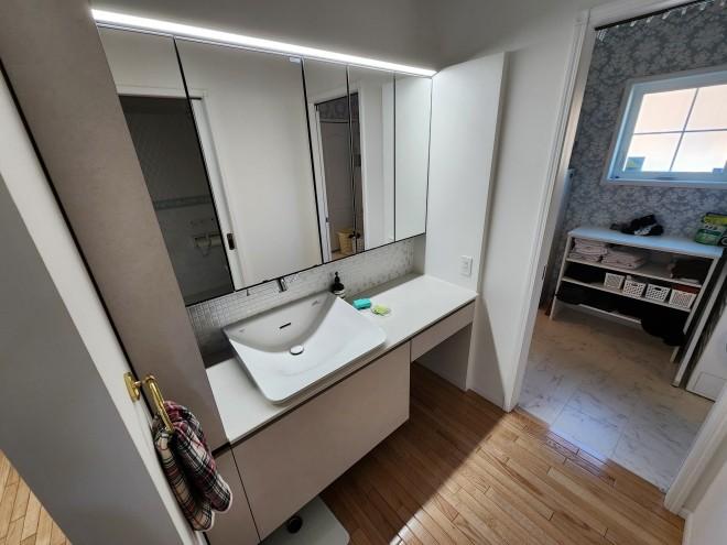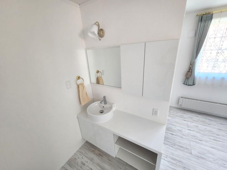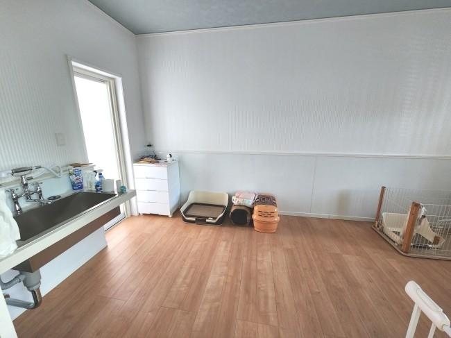 またオーバーヘッドシャワーが付いた1.25坪の浴室や洗面台もほとんど使用感が無いキレイな状態です。間取りは14.8帖の吹き抜けが開放的な3SLDKの他ペット用洗場付の部屋は汚れに強いホーロー製の腰壁で勝手口から裏側の広いドッグランにアクセスできます。