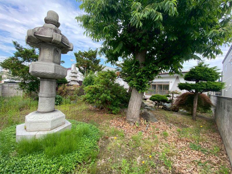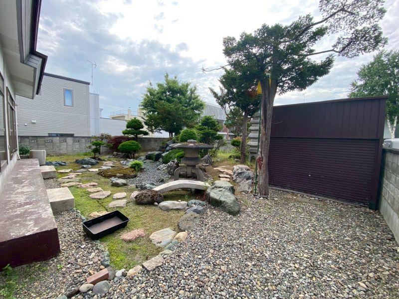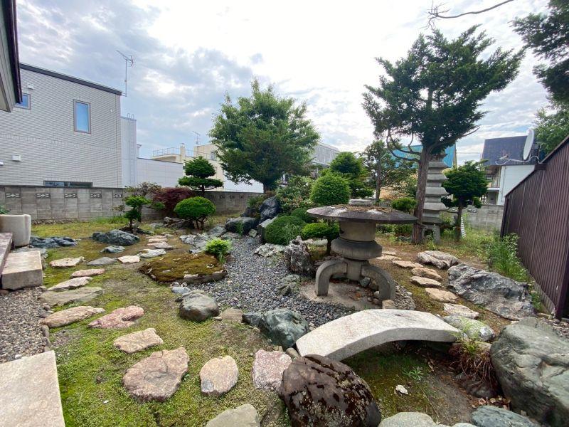 広々とした敷地には、手入れの行き届いた植栽と立派な灯篭、飛び石や苔庭が美しく調和し、まるで小さな日本庭園のような空間が広がっています。