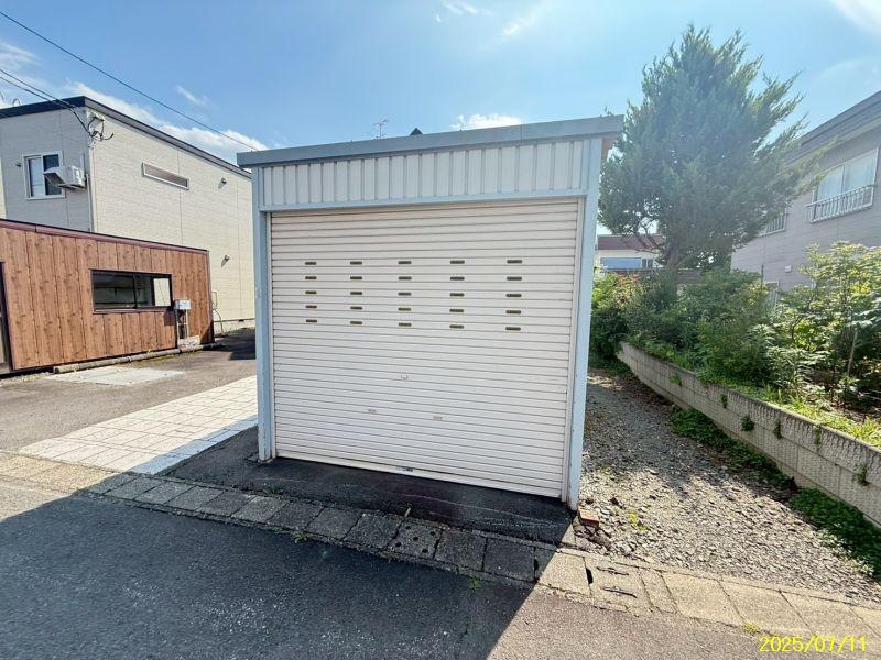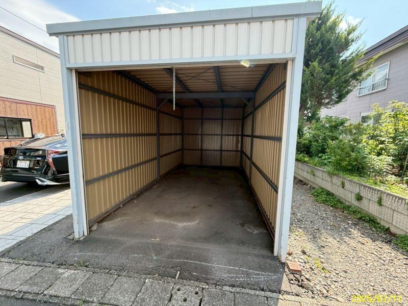 大型車庫付き、駐車場3台可能☆敷地内にプレハブもあり物置としての使用も可能です☆