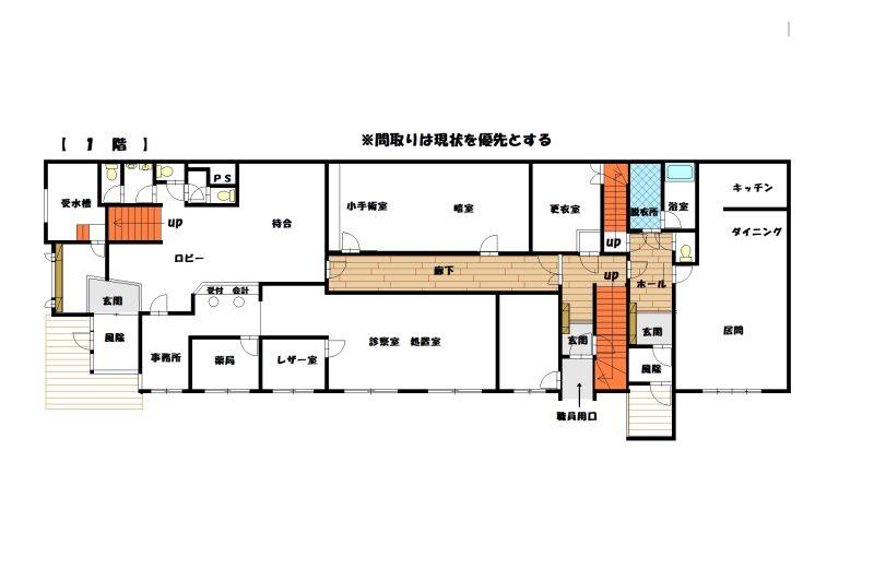 医院は1階待合室、事務室、診察室、診察室、手術室・水回り・2階病室4部屋、手術室、厨房、水回り