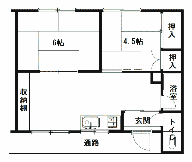 4戸入居中、ガス給湯器、汲み取り(一部水洗)。