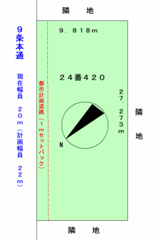 市内中心部、9条通りに面した間口の広い土地(準防火地区)。