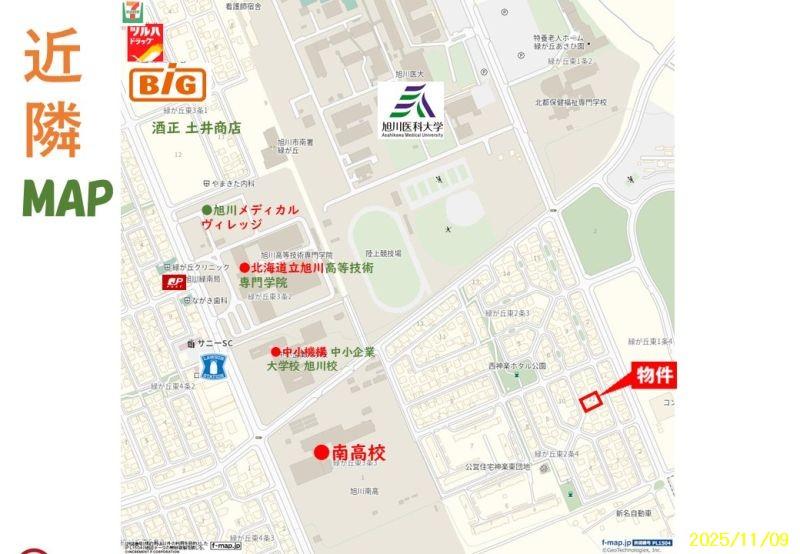 旭川医大の東側のリサーチパーク南側・ウッドタウン場所はここです☞ https://maps.app.goo.gl/zzn5MwoN6NaWSfMJ8 緑が丘文教タウン、通抜けできない街区で静かな環境です。お買い物もツルハドラッグ、BIG 旭神町のCOOP、BESTOM