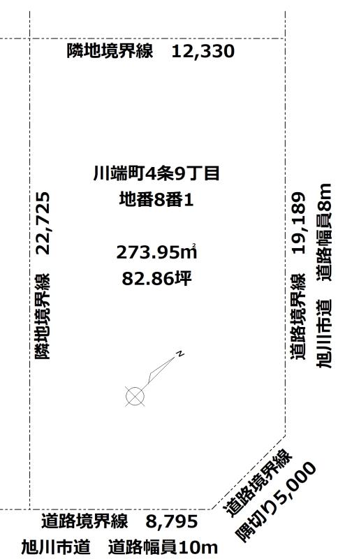 角地隅切り5.000m。南東側間口12.330(8.795)m、北東側間口22.725(19.189)m