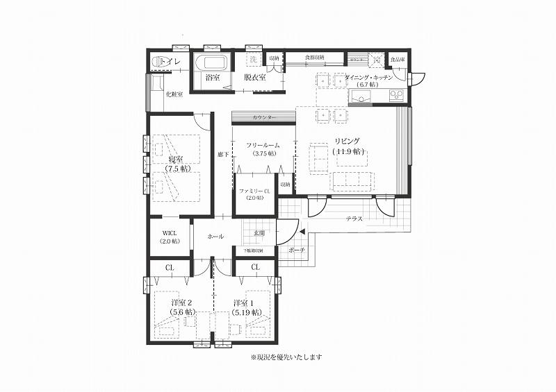 リビングは余裕の天井高にて開放感のある空間となり、フリールームを中心に配置、動線の取れた間取りとなっております♪