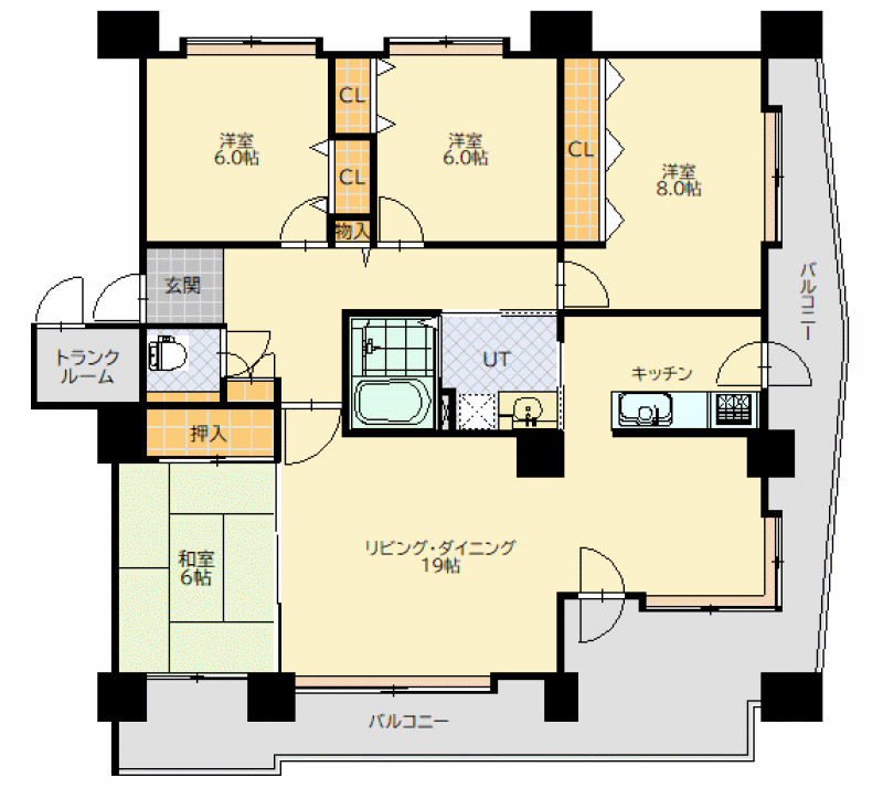 ロジェ美術館通りイースト708号室、7階角部屋の広々した4LDKです。2面バルコニーで日当たりも良好、病院なども近く住環境が整っているエリアです。