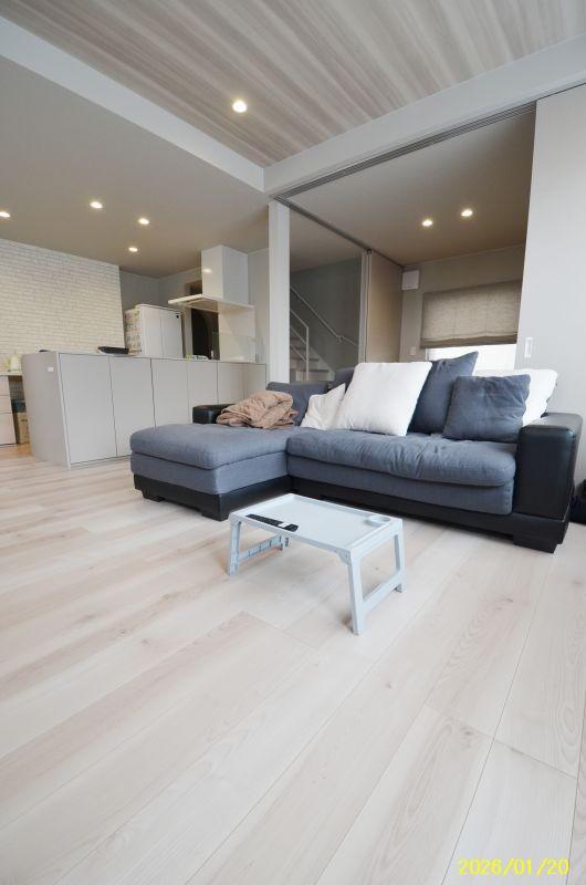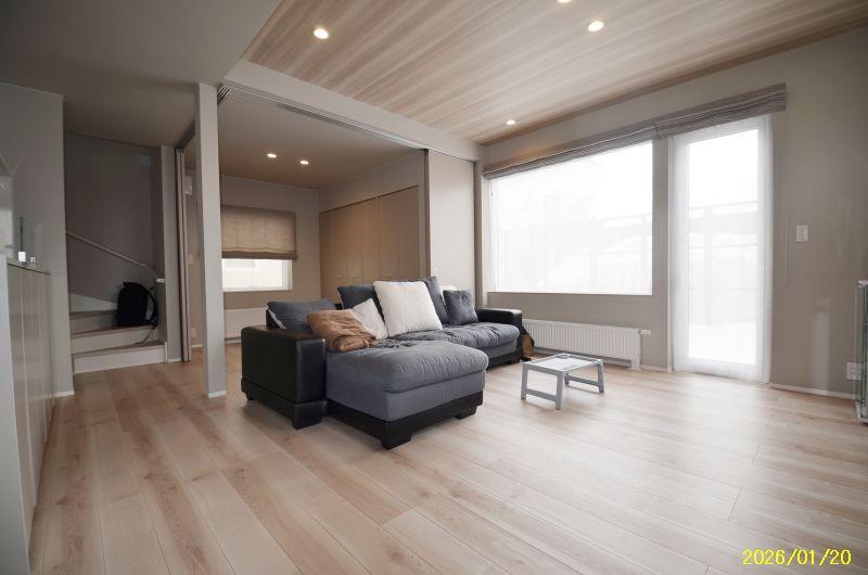 東鷹栖の閑静な住宅街に、家計画施工・築2年の4LDK物件が出ました。キッチンを中心とした回遊動線で、スムーズに家事がこなせる間取りになっています。1階の洋室はハイドア仕様で、ドアを開けるとリビングと一体化し、広々と利用することができます。さらに、1階にはコンパクトな書斎があり、在宅ワークや趣味のスペースとしても活用可能。2階には約3帖のウォークインクローゼットを完備しており、収納も充実しています。駐車スペース:青空3〜4台