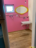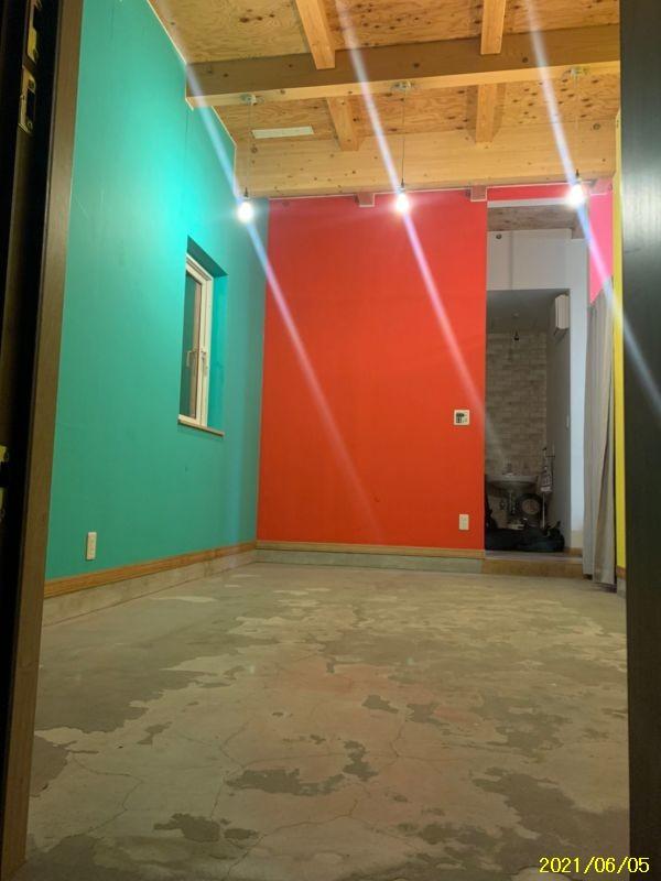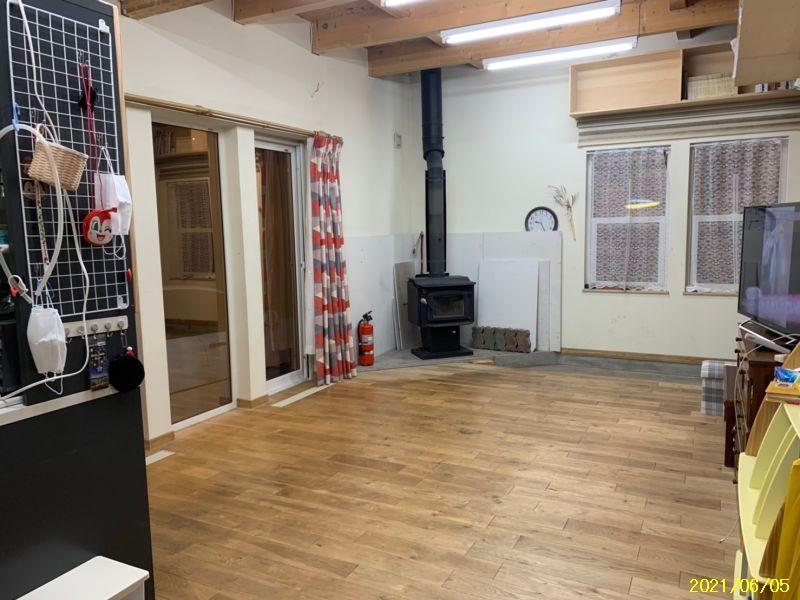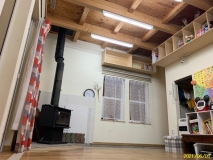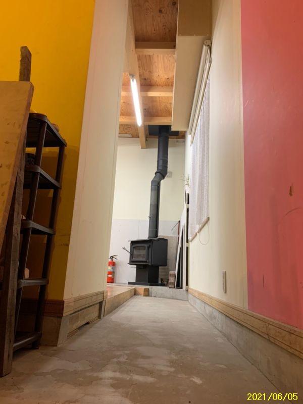 玄関開けて、正面が土間フリースペース(床暖房)で7.5畳あり、雑貨屋等のショップにも最適です。。ECOジョーズと併用で薪ストーブを設置しており十分な暖を取れます。
