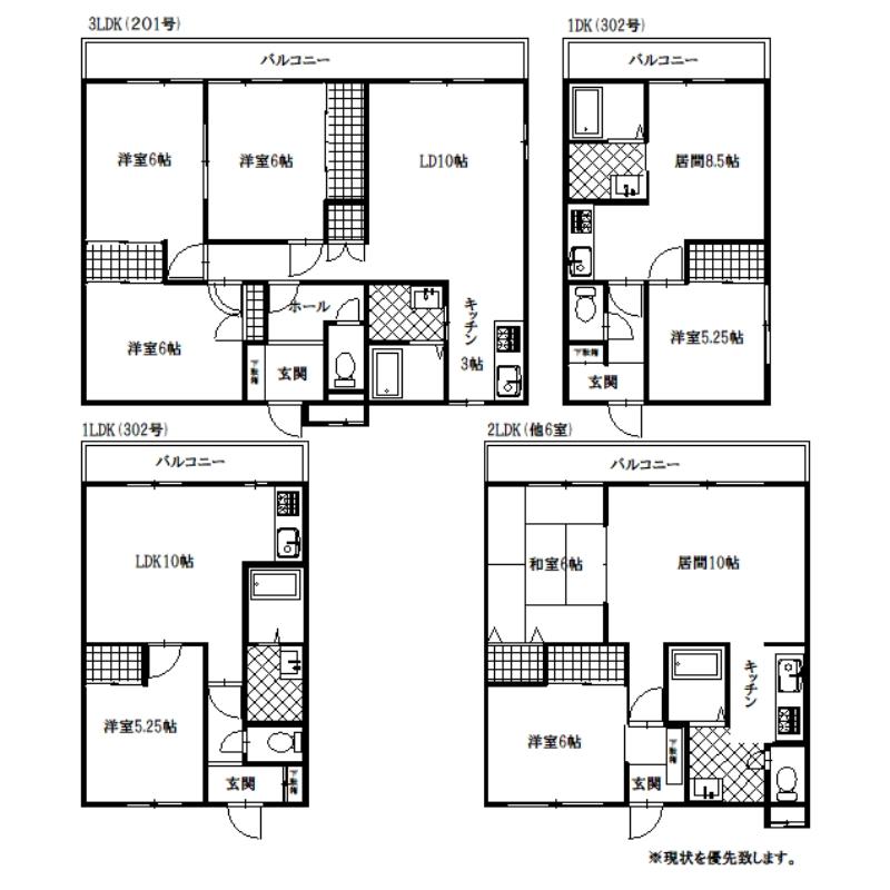 満室利回り12.71%。3LDK,2LDK,1LDK,1DK,テナント混合物件。エアコン、灯油暖房、物置もあり。角地