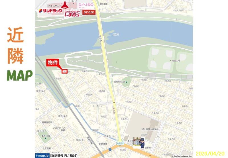 石狩川河川敷地に隣接、堤防に登り口にあります☞https://maps.app.goo.gl/VD51jDvRUG7JLzCT7 少し歩いて石狩川の旭西橋を渡るとウエスタン 川端+カレーカフェスーリヤ旭川店+七輪焼肉安安 旭川川端店+めん丸 飲食店も多々