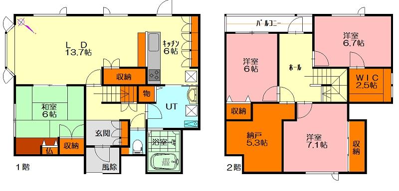 - 4LDK / 1F)13.7LD+6K+6 2F)6+6.7+7.1