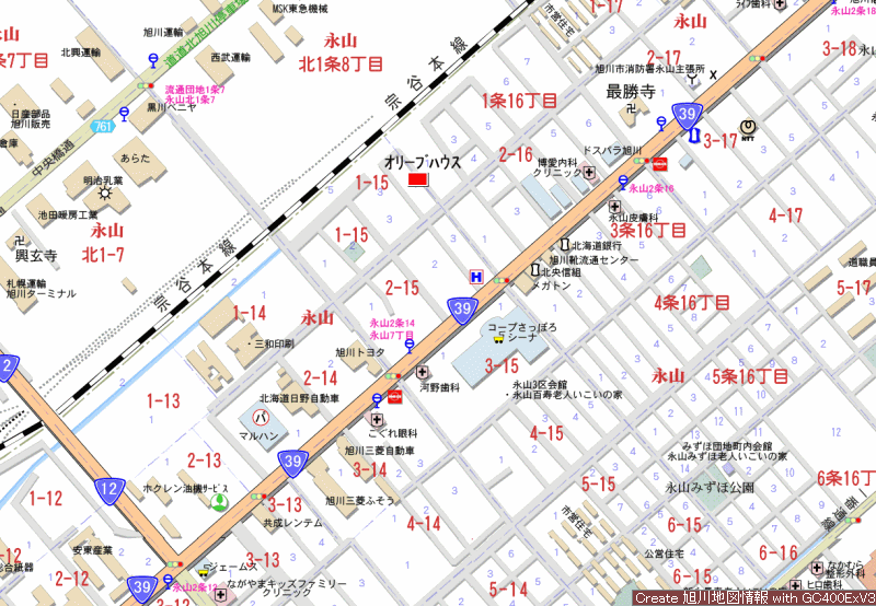 コープさっぽろシーナ、イオン永山店、国道39号近く商業施設多い、旭川大学・旭川志峯高校