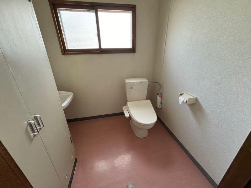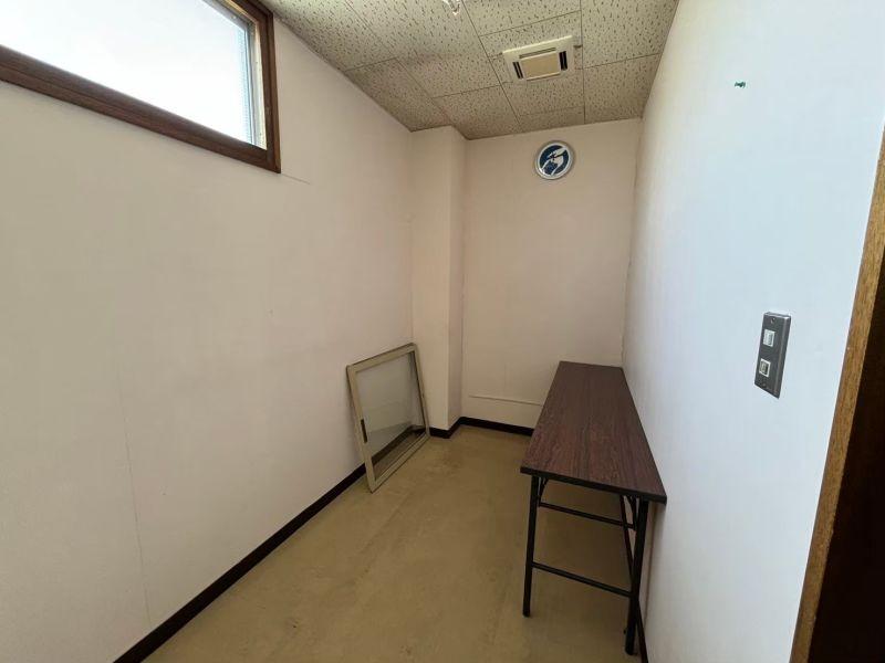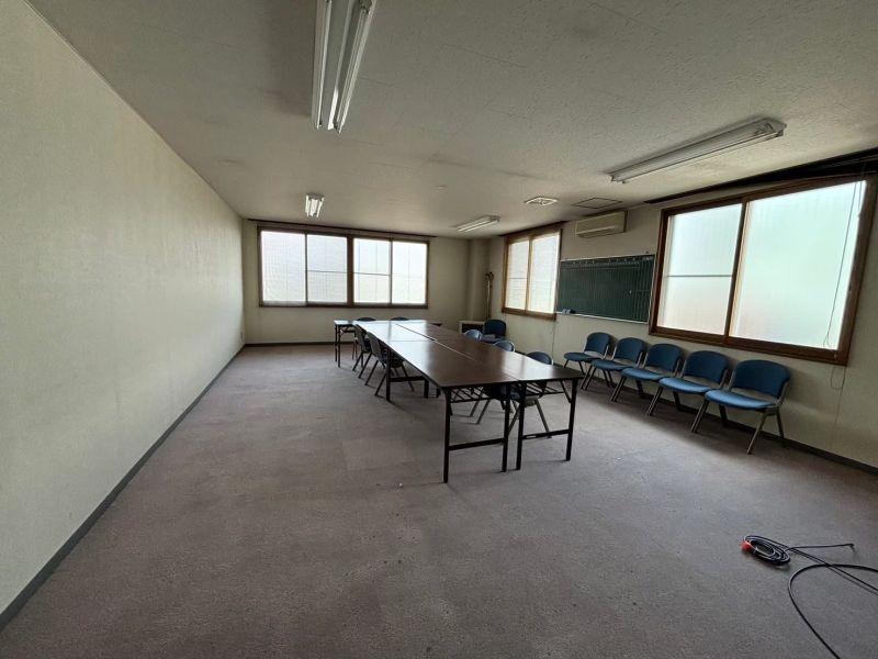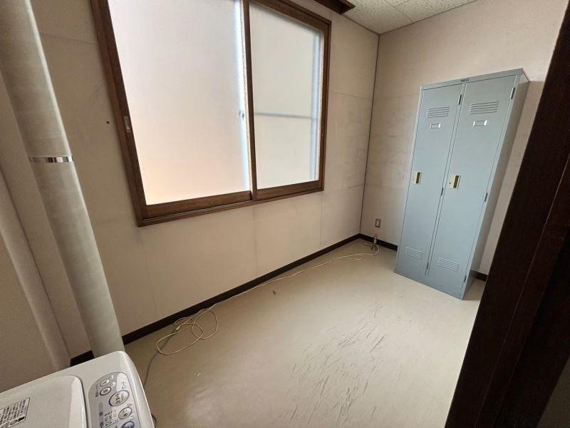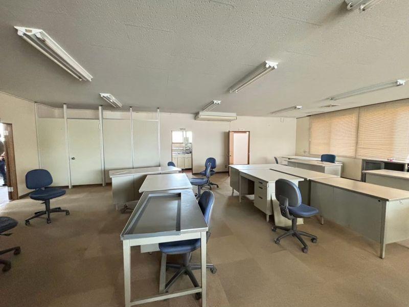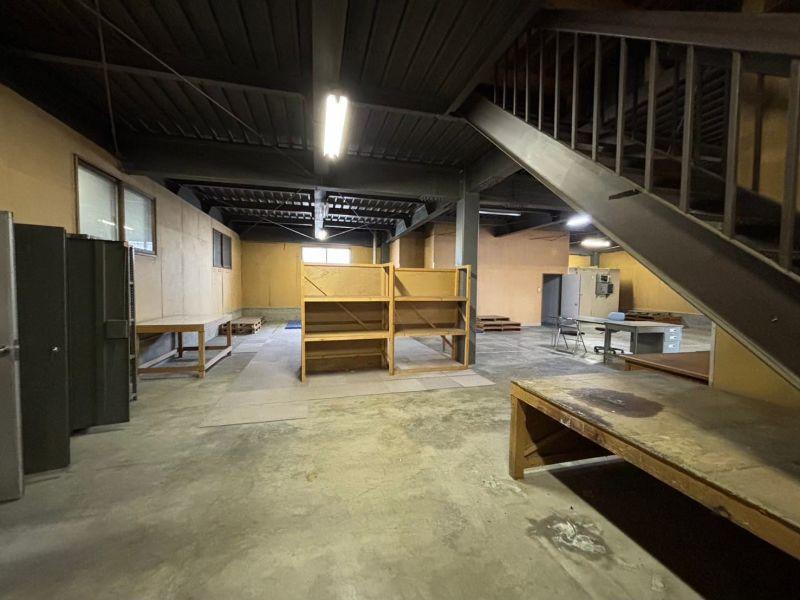 男女別トイレ、給湯室付。奥は部屋になっており会議室や接客スペース、資料室としても使用できます。駐車場は手前と、裏側の敷地が広いのでかなりの台数停められます。大型車の駐車や土場としても使用できます。