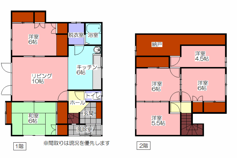 - 6SLDK / 1階:10リビング+キッチン+6洋+6洋 2階:6洋+6洋+5.5洋+4.5洋+納戸